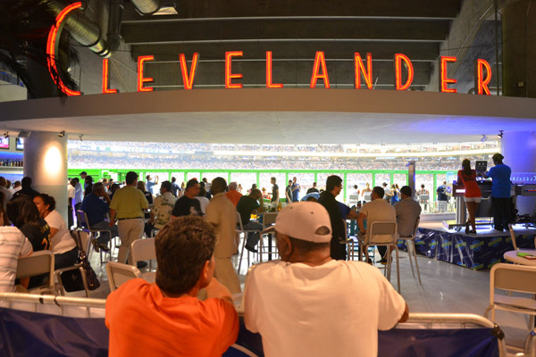 We began our evening sitting in great seats behind the first baseline, taking in all the sights and sounds of the game and the stadium. The Clevelander, way off in the distance on the other side of the field, seemed innocuous from afar. Then I saw a tweet from @Clevelander1200 which read “$5 Three Olives snowball.” Well the tweet said some other stuff too, but none of that is important. Now we knew we had to check out the bar and we had to get a vodka snow cone, so we planned our exploration for middle of the 5th inning and made our way over.