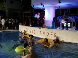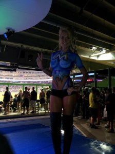The place was packed and immediately upon entering there is a party feel. There is a lot going on and a lot to take in. First thing that hits you is that there really is a pool!! Right there in middle of the bar and there are people in it having a damn good time. Because of the Three Olives promotion they had beautiful, naked models being airbrushed live right on stage. The deejay was playing great music and folks don’t seem to be paying much attention to the game. It feels like you are no longer even in the stadium. Let’s see…there are beautiful people, a full bar, cocktail tables and chairs, a pool, a mermaid, cheerleaders, and even a beer pong table outside. Well that’s all on first glance… but all elements that make for a great bar and a lot of debauchery.