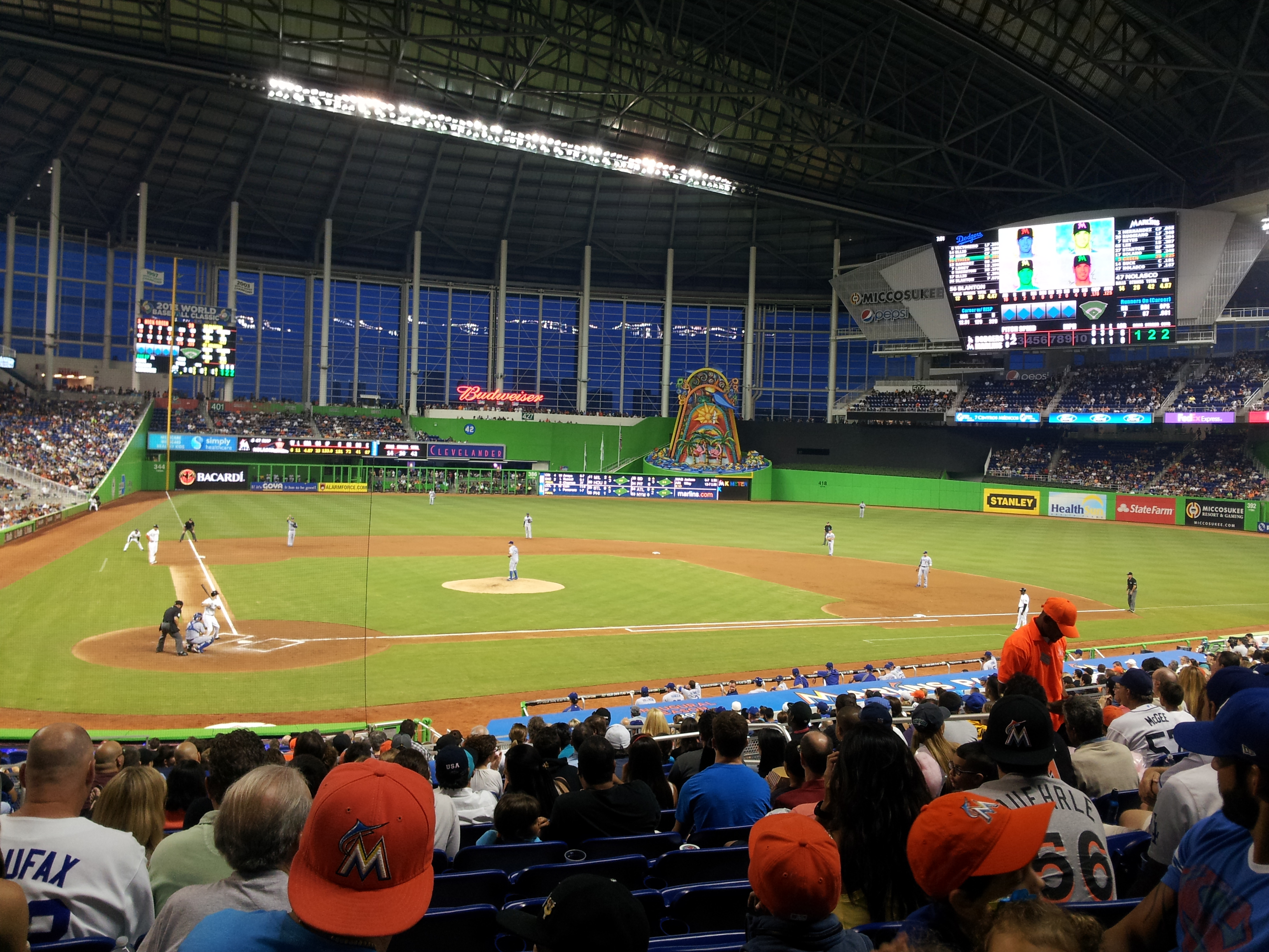Saturday night we headed out to the new Marlins stadium in Miami to check out the visiting LA Dodgers play the Marlins. It was my first visit to the stadium and the one thing I knew I had to do during my visit was check out the Clevelander Bar they built into the stadium. I had heard great things and admired the genius of incorporating a longstanding Miami landmark…along with a pool…into this new landmark. I mean if you have ever visited Miami you have been to the iconic Clevelander on Ocean Drive. My guess is that you have probably gotten drunk there and if you really had a good time, you may even have drunk pics taken by your so-called friends of you dancing on the stage in a bikini like most drunk tourists tend to do. It is one of the ultimate party bars on South Beach, so it made perfect sense to take a slice of it and put it in Marlins stadium.