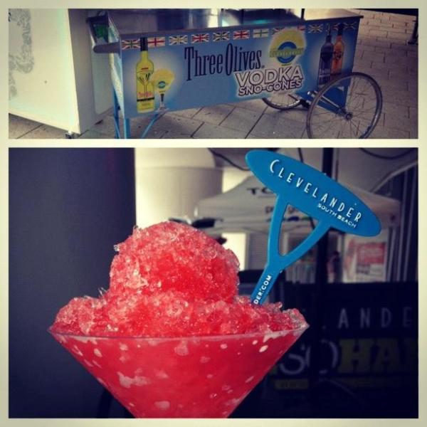 We made our way outside to the Three Olives ice shaving stand excited to try a liquored-up snow cone. The lovely Jenese was our bartender. She started rattling off the list of flavors we could choose from, “rainbow, blue crush, skittles, jolly rancher …” all of them sounded fun and yummy. I decided to go with the blue crush made with Berry-flavored Three Olives; my comrade chose the skittles made with Cherry-flavored Three Olives. Jenese shaved the ice right in front of us and then topped the perfect ice balls, served in cute little martini glasses, with syrup and vodka. Now these snowballs do not get a lot of points for complexity, they are basically syrup and vodka, but I do give our Jenese a lot of credit for coming up with the mixes and the creative names. However, what they lacked in depth they definitely made up for in presentation and flavor. And while they might not be quite manly, they sure do pack a lot of bang for the buck (I did say they are just syrup and vodka). They were luscious!! The mix of heavenly sweet syrup and the flavored vodka with the chill of the ice as a perfect accessory was definitely one of the coolest drinks I have ever had. So we had a few more….and continued to enjoy our time at the Clevelander.
